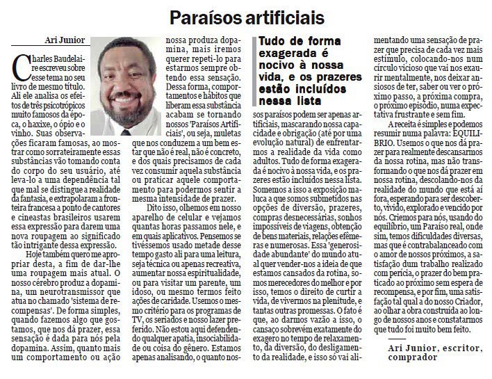 Hoje também quero me apropriar desta, a fim de dar-lhe uma roupagem mais atual. O nosso cérebro produz a dopamina, um neurotransmissor que atua no chamado ‘sistema de recompensas’. De forma simples, quando fazemos algo que gostamos, que nos dá prazer, essa sensação é dada para nós pela dopamina. Assim, quanto mais um comportamento ou ação nossa produza dopamina, mais iremos querer repeti-lo para estarmos sempre obtendo essa sensação. Dessa forma, comportamentos e hábitos que liberam essa substância acabam se tornando nossos ‘Paraísos Artificiais’, ou seja, muletas que nos conduzem a um bem estar que não é real, não é concreto, e dos quais precisamos de cada vez consumir aquela substância ou praticar aquele comportamento para podermos sentir a mesma intensidade de prazer.