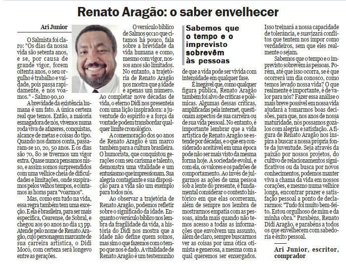 Mas, como em tudo na vida, essa regra também tem uma exceção. E ela é brasileira, para ser mais específica, Cearense, de Sobral, e chegou aos 90 anos no dia 13 pp. Atende pelo nome de Renato Aragão, cujo personagem marcante de sua carreira artística, o Didi Mocó, com certeza será longevo entre as gerações.
